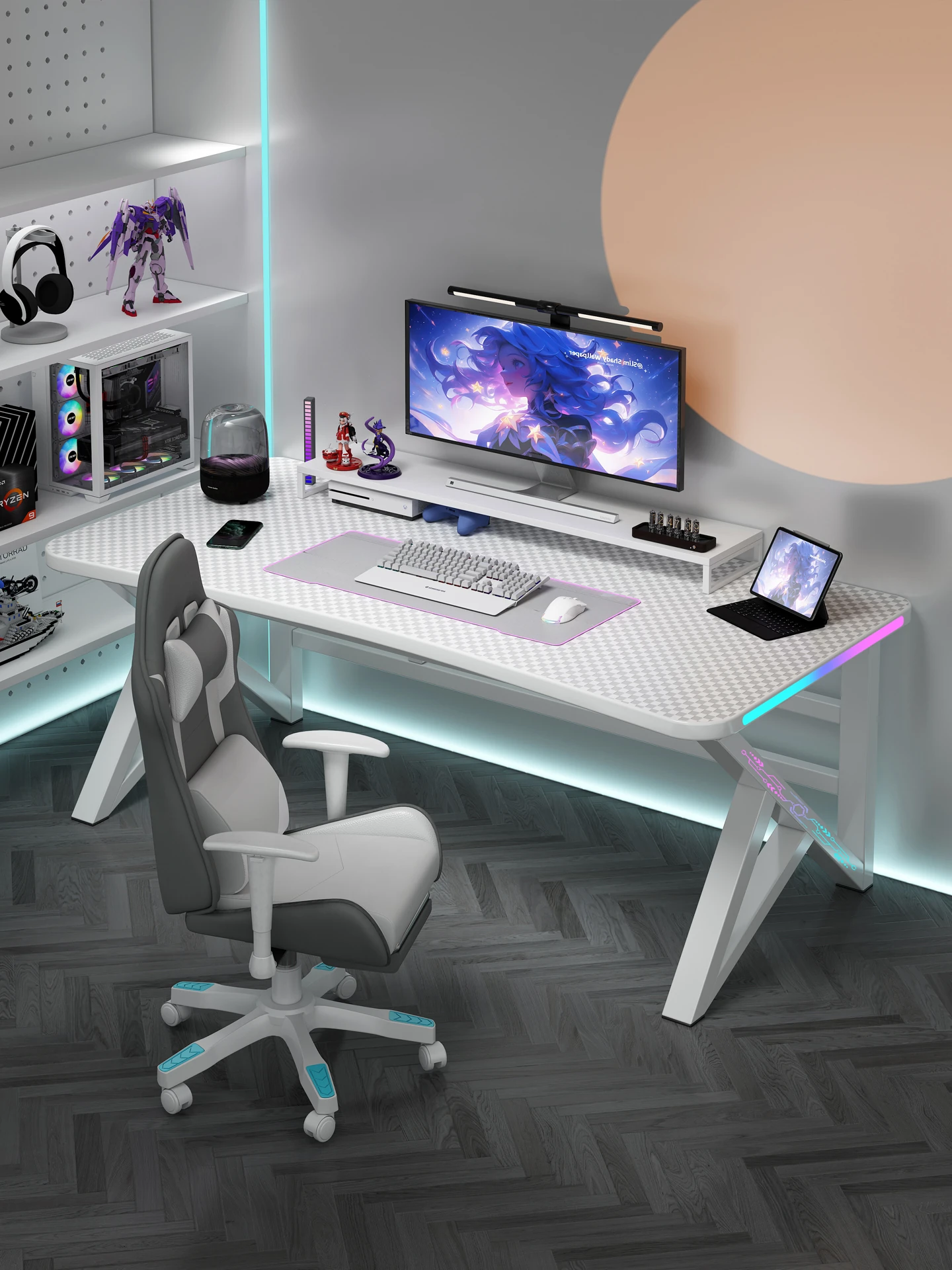 Gaming Desk for Girls - Stylish Carbon Fiber Computer Table for Home Office with Adjustable Mechanical Arm, Perfect for Bedroom Use and Workstation Setup
