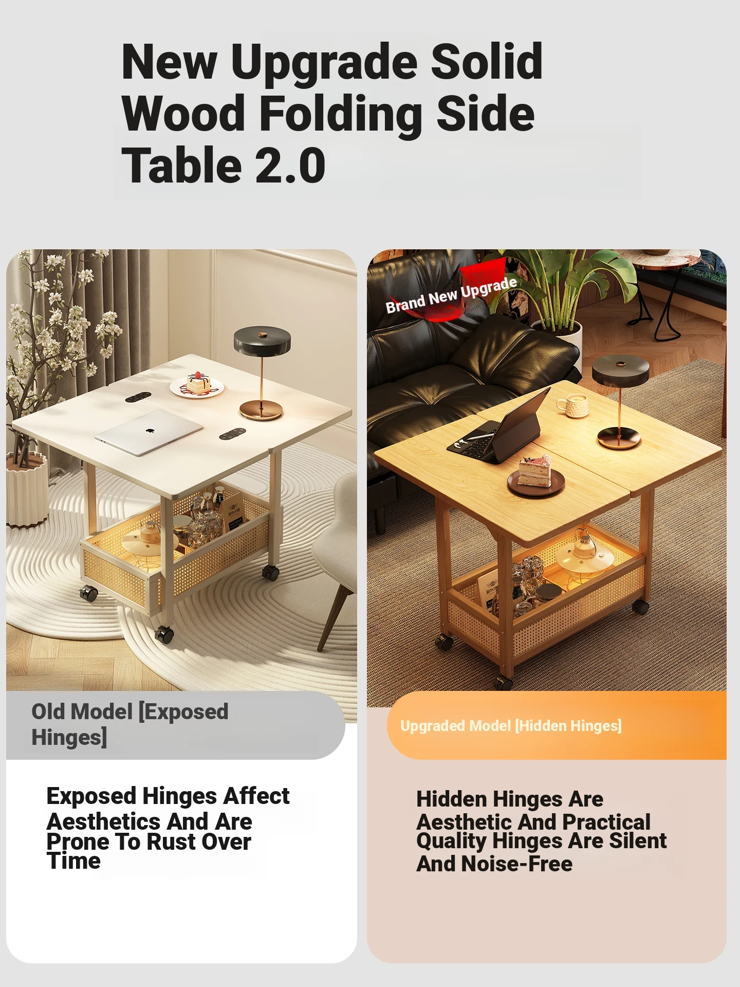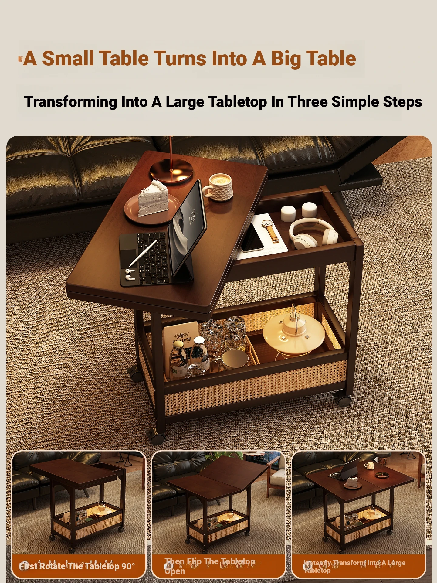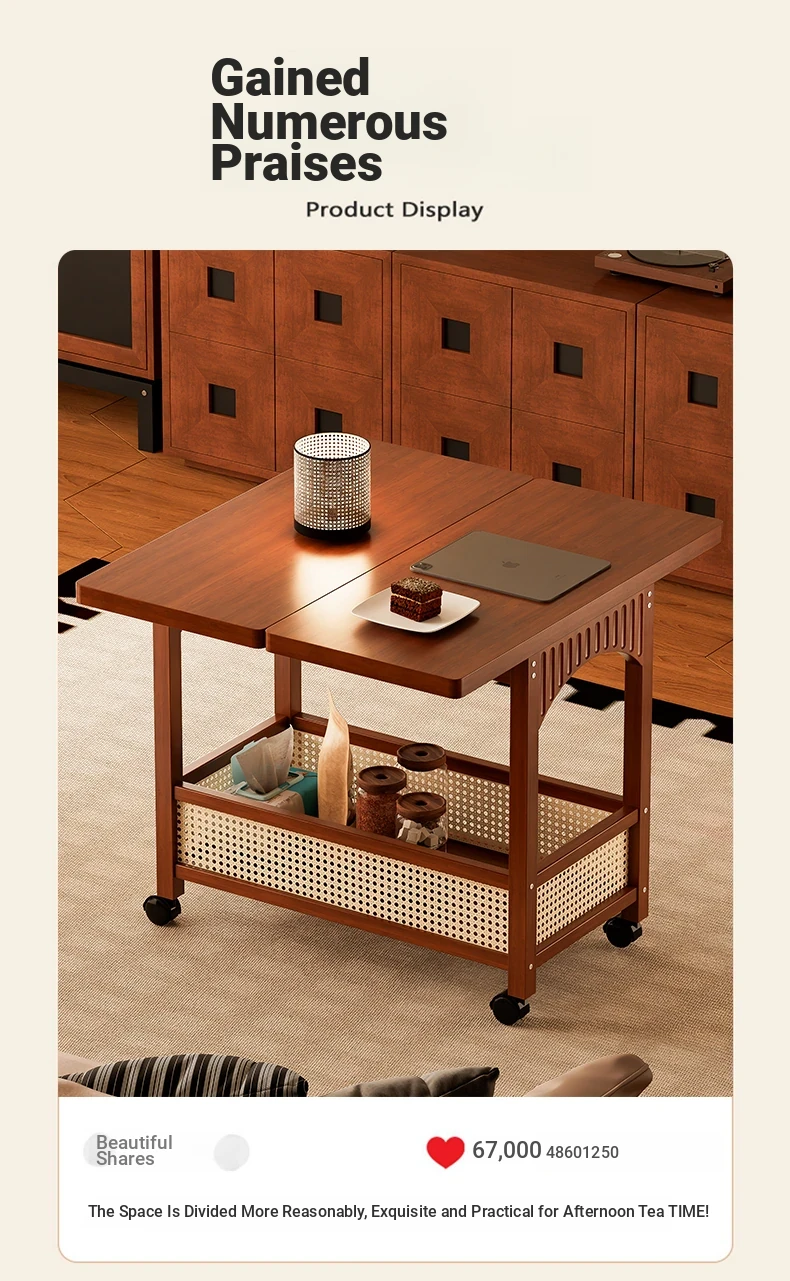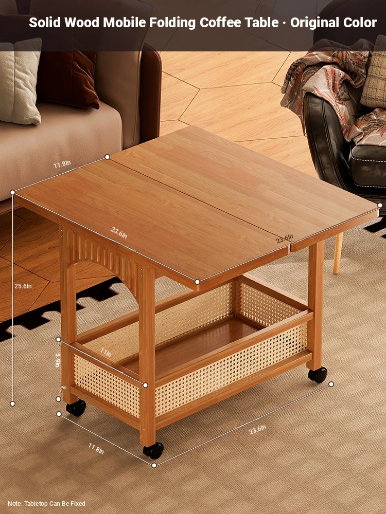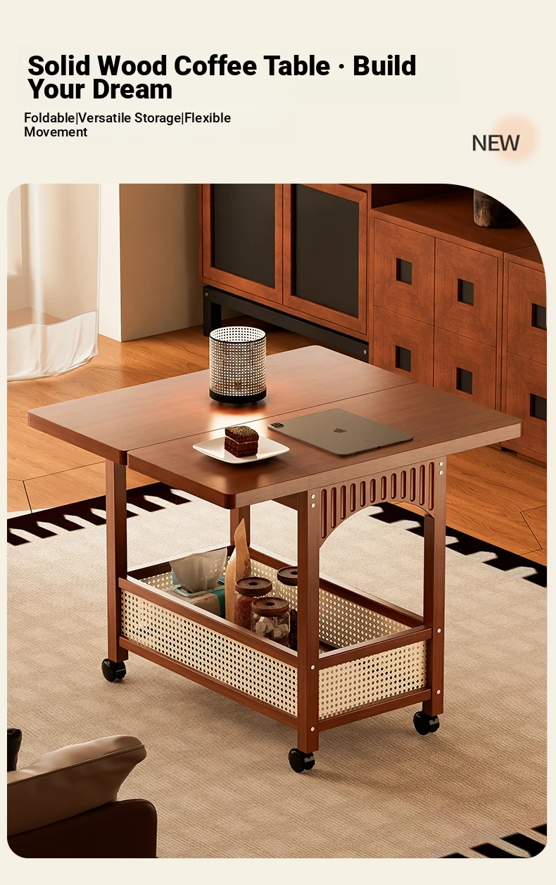 Foldable Solid Wood Tea Table - Vintage Style Mobile Side Table for Living Room, Space-Saving Expandable Sofa Cabinet