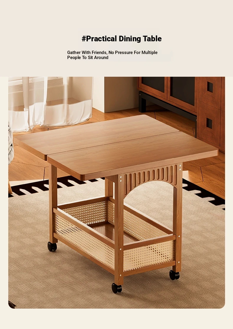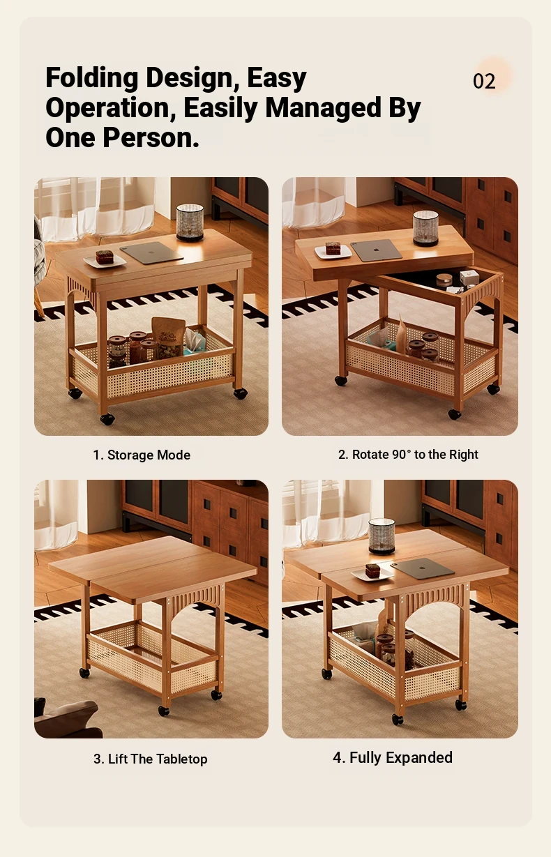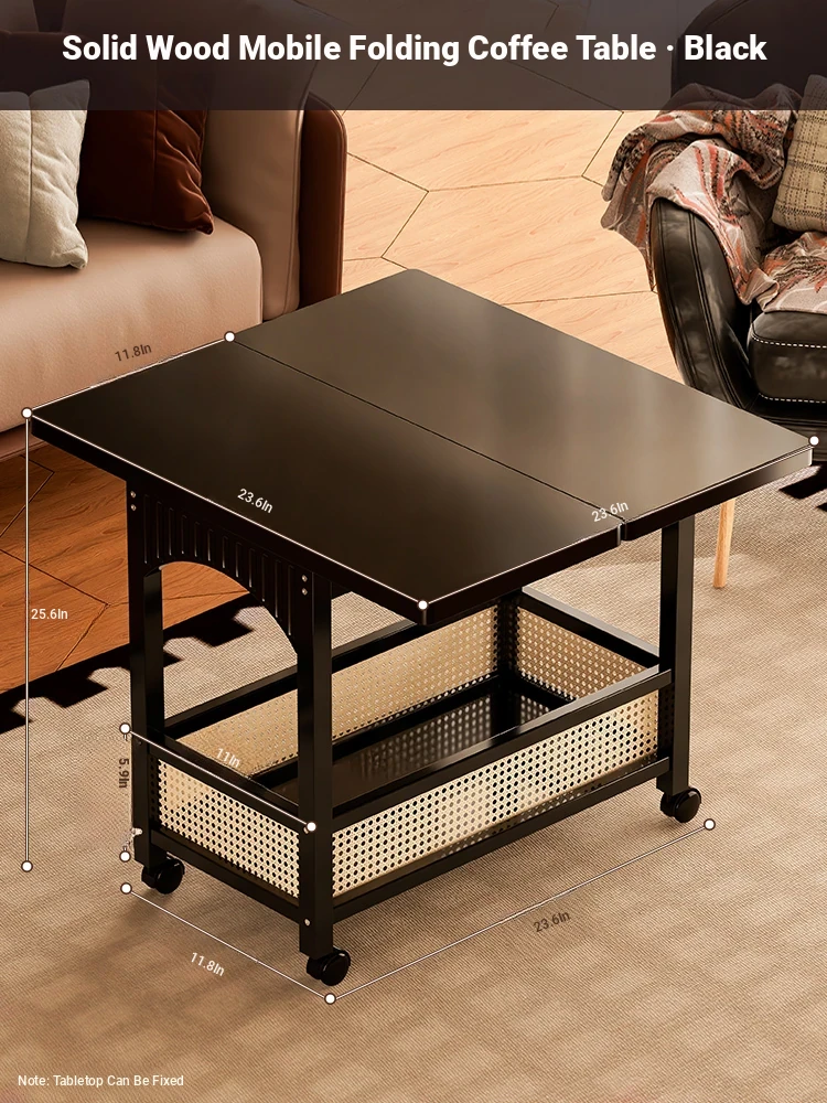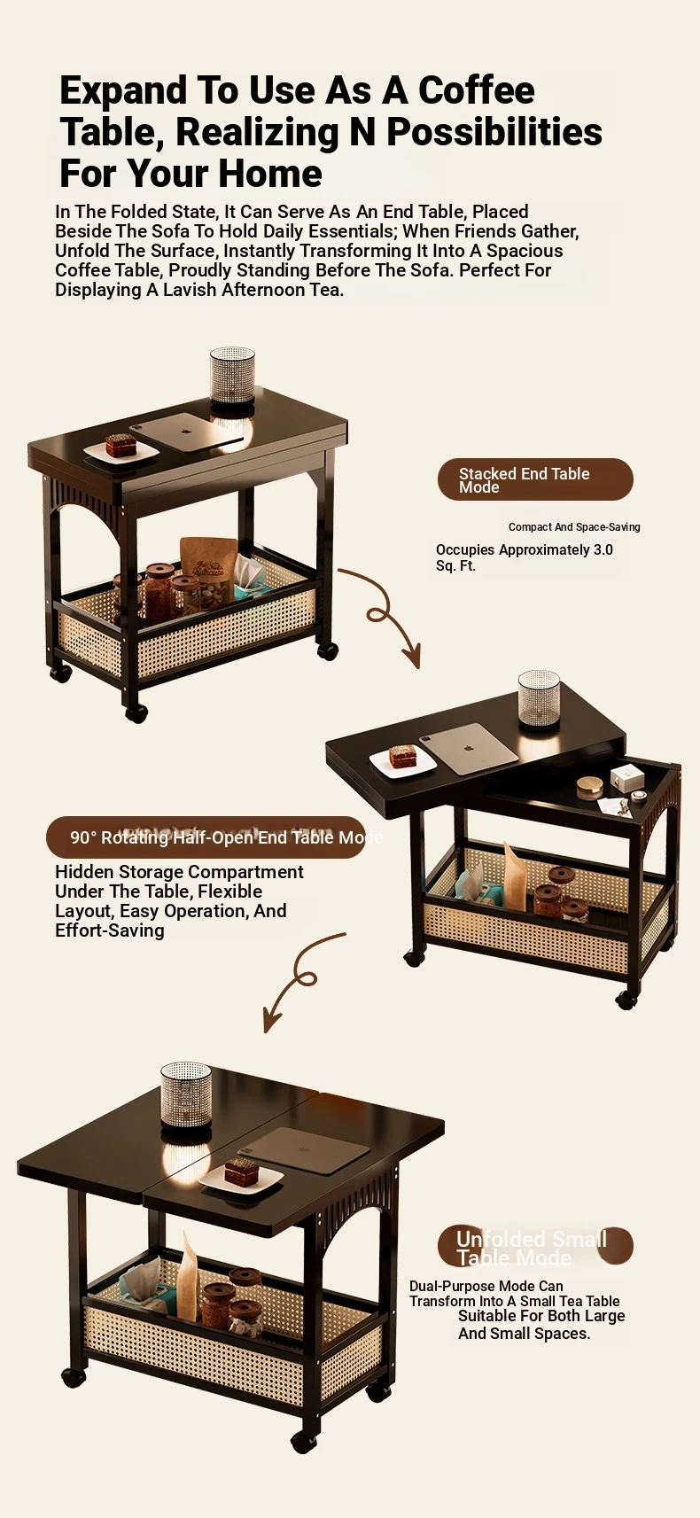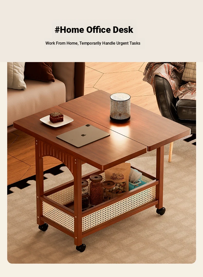 Foldable Solid Wood Tea Table - Vintage Style Mobile Side Table for Living Room, Space-Saving Expandable Sofa Cabinet