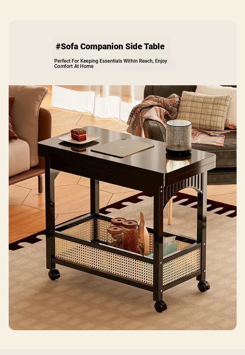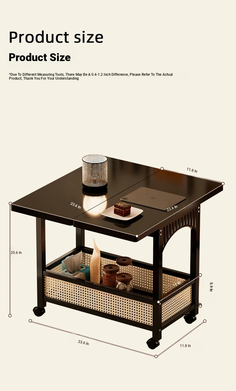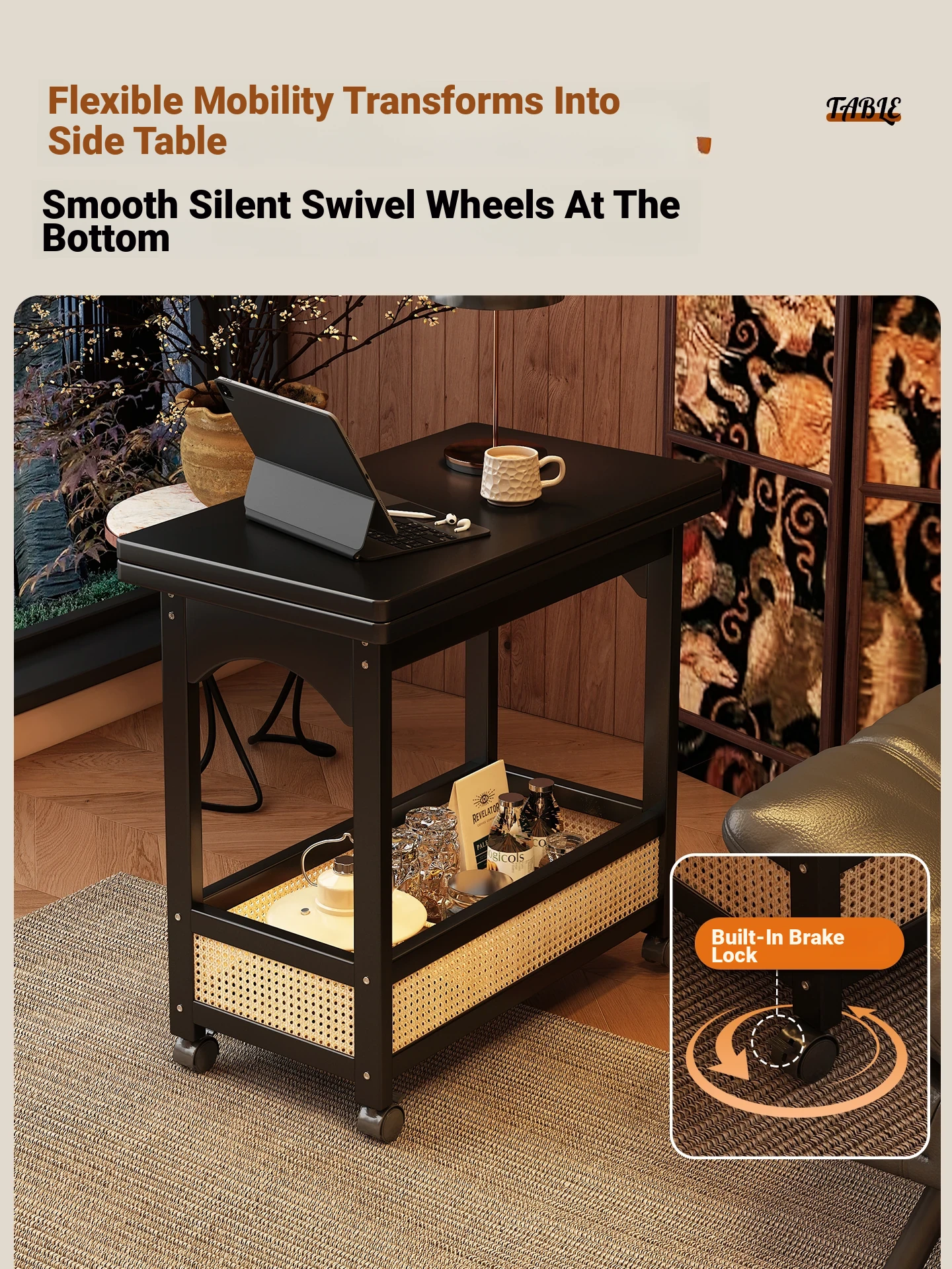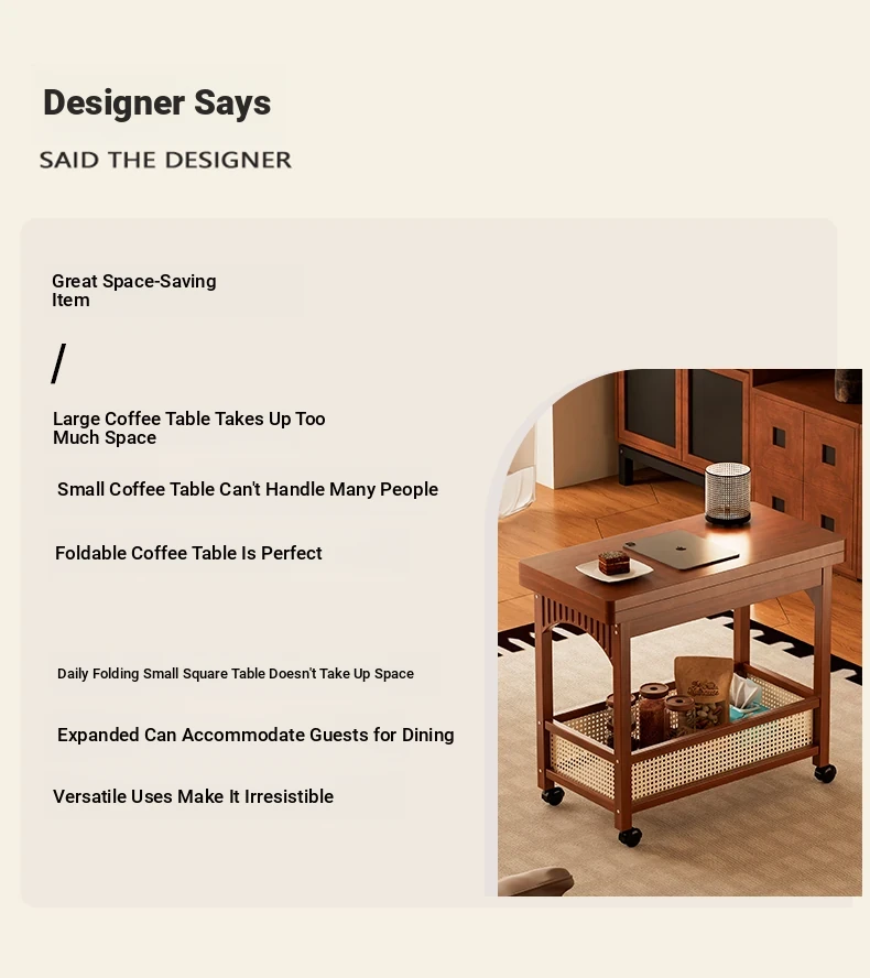 Foldable Solid Wood Tea Table - Vintage Style Mobile Side Table for Living Room, Space-Saving Expandable Sofa Cabinet