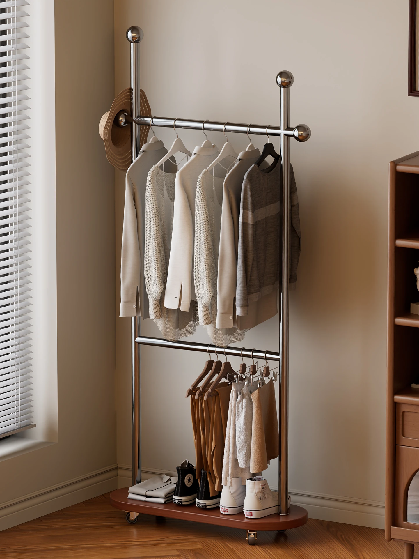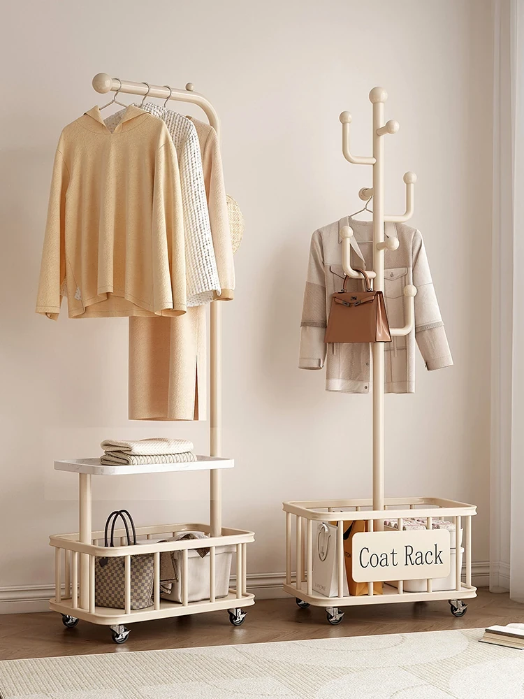 Cream-Colored Freestanding Coat Rack with Wheels - Stylish Bedroom Clothes Hanger and Storage Solution for Home Use