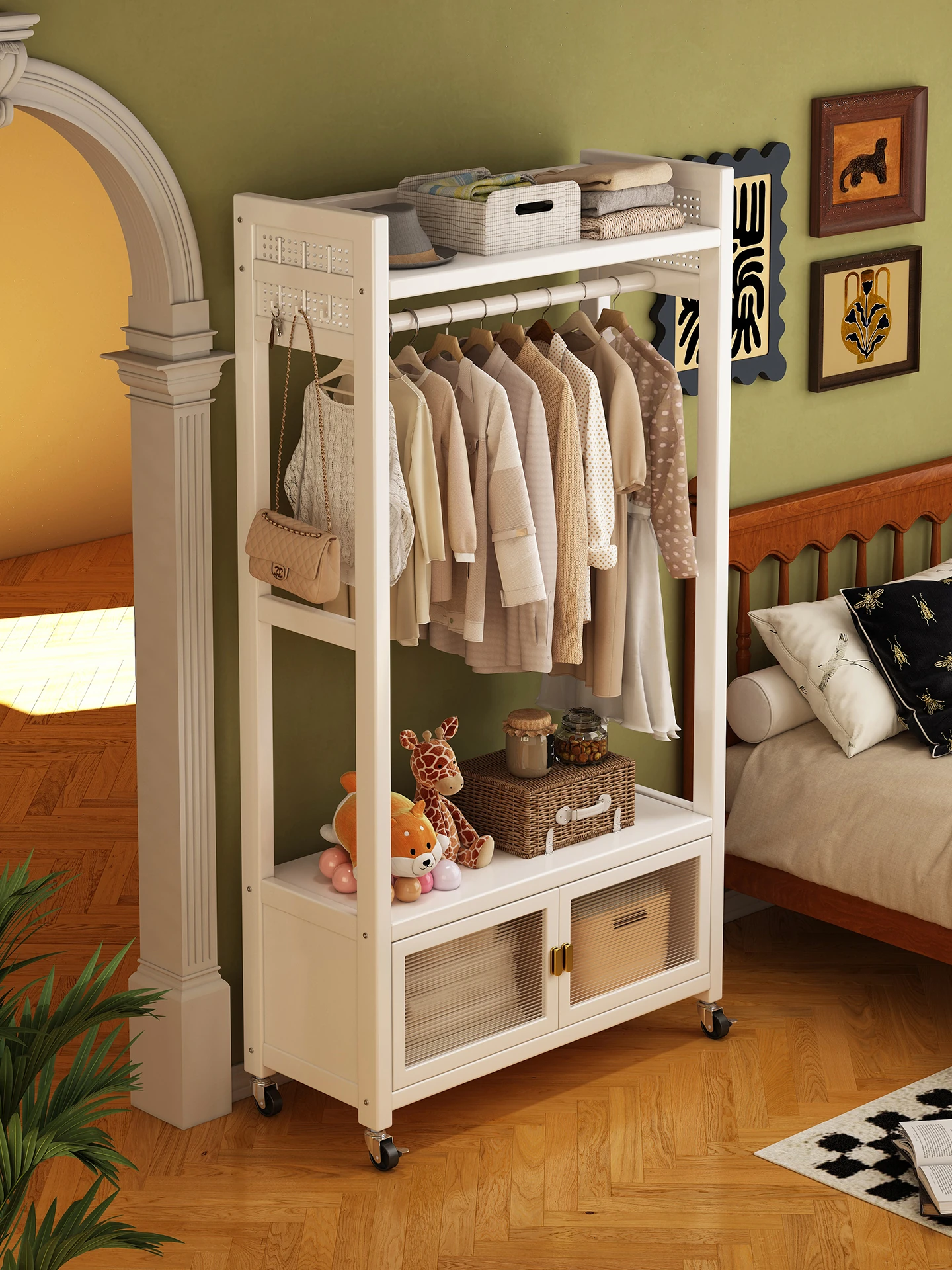 Compact Bedroom Floor Coat Rack - Easy Assembly Metal Wardrobe Storage Cabinet in Creamy Style, Perfect for Small Spaces