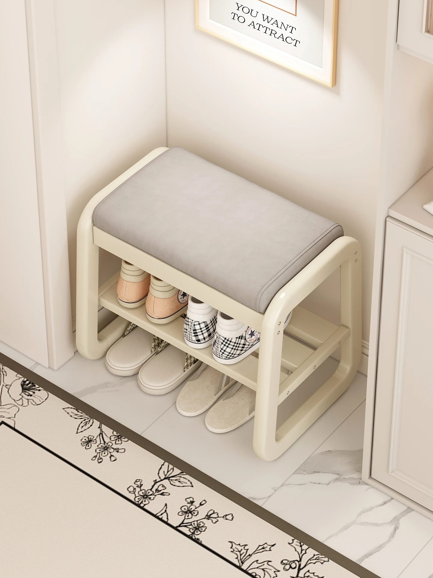 Narrow Solid Wood Entryway Shoe Bench - Creamy Storage Stool for Home, Perfect for Small Spaces, Ideal for Putting on Shoes by the Door