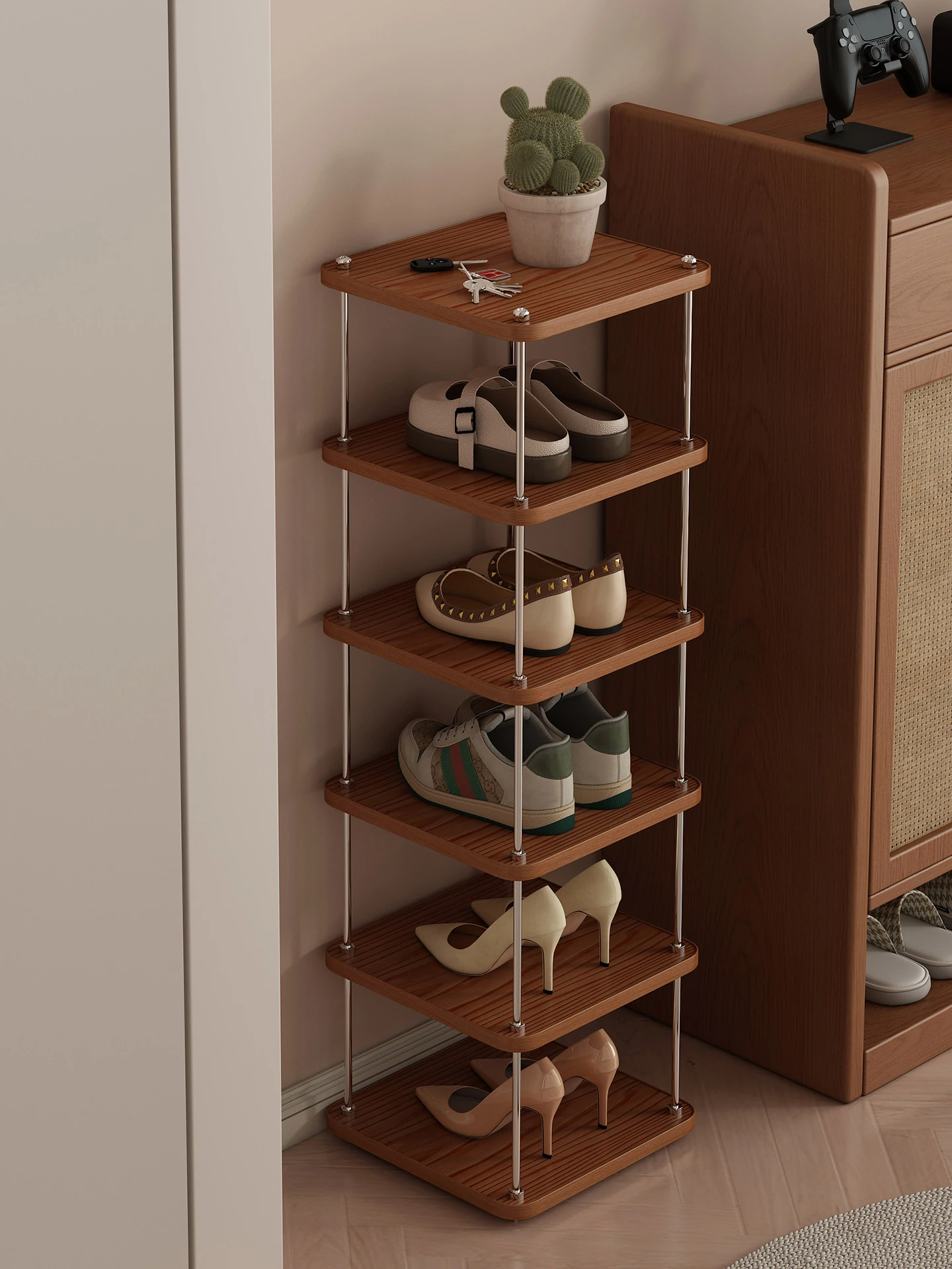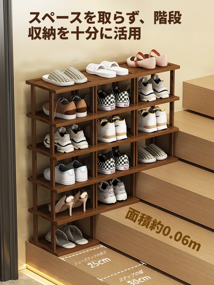 玄関を彩る!階段型シューラック - 多層収納でスッキリ整理、角にもフィットするコンパクトな靴棚。家族みんなの靴をスマートに収納!