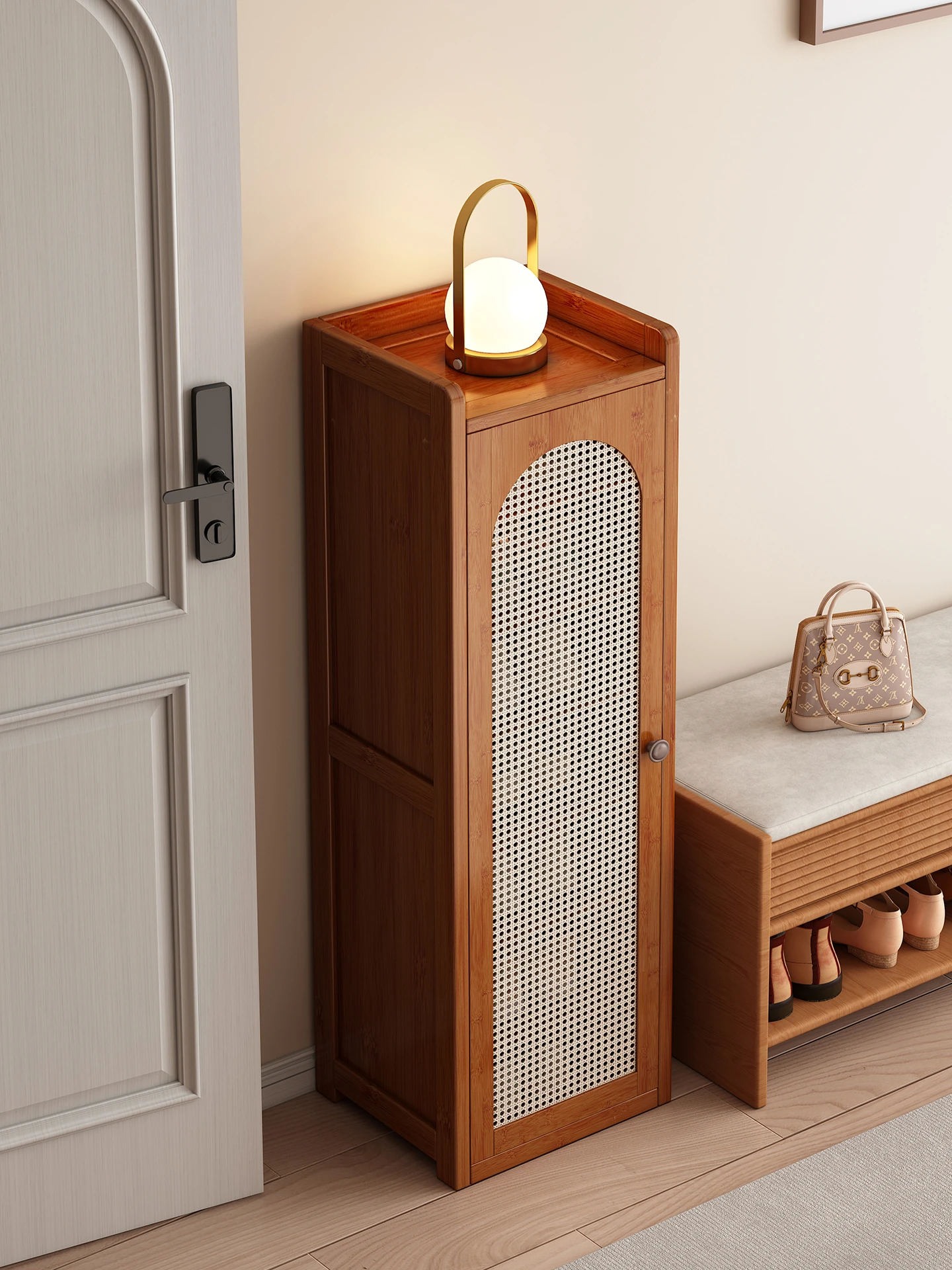 玄関用スリッパチェア - スリムデザインで便利!靴を履く際のサポートに最適!収納もできるシューズキャビネット一体型の試着用ベンチ。狭いスペースでも大活躍!おしゃれで実用的なアイテムです。
