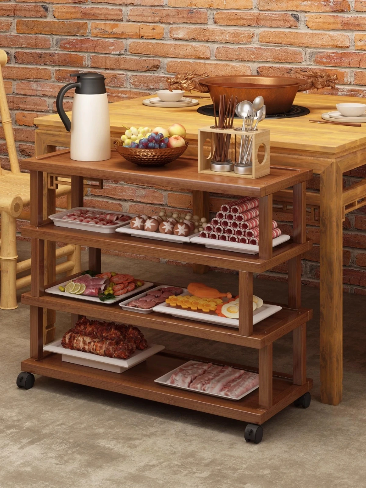 火鍋店専用の多層調理台!焼肉や串焼きにも最適なキャスター付き備え付けワゴン、料理の効率をアップ!商用にぴったりな収納力で、キッチンをスッキリ整理!