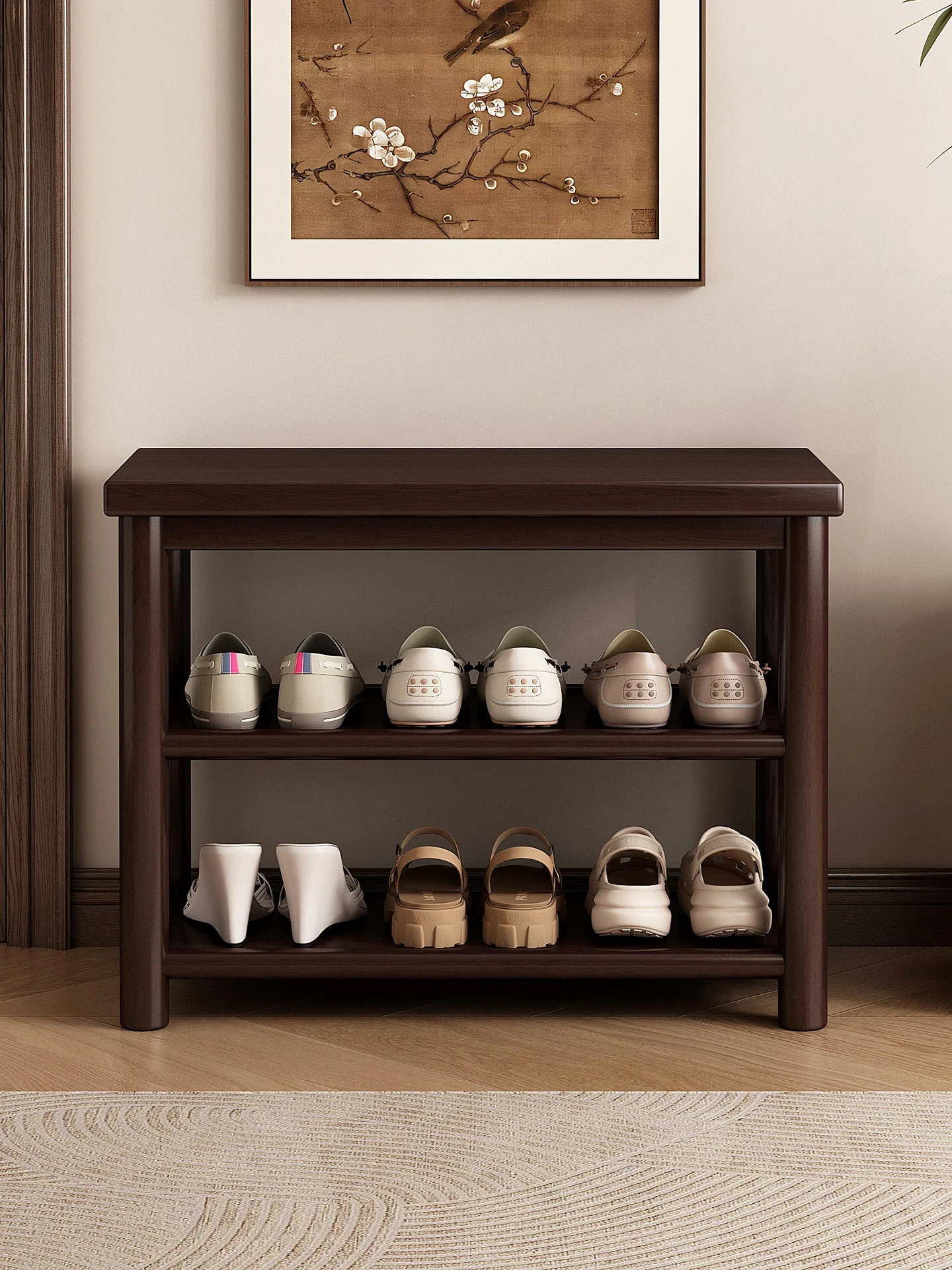 玄関用実木製スツール|靴を脱ぎ履きしやすいコンパクトなデザイン|おしゃれな靴箱一体型|試着室にもピッタリ!快適な入室体験を提供します!