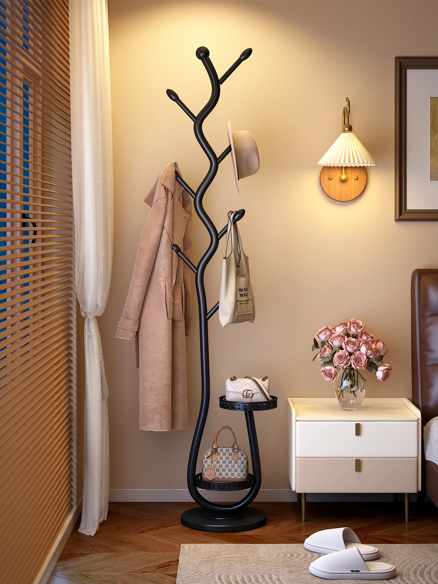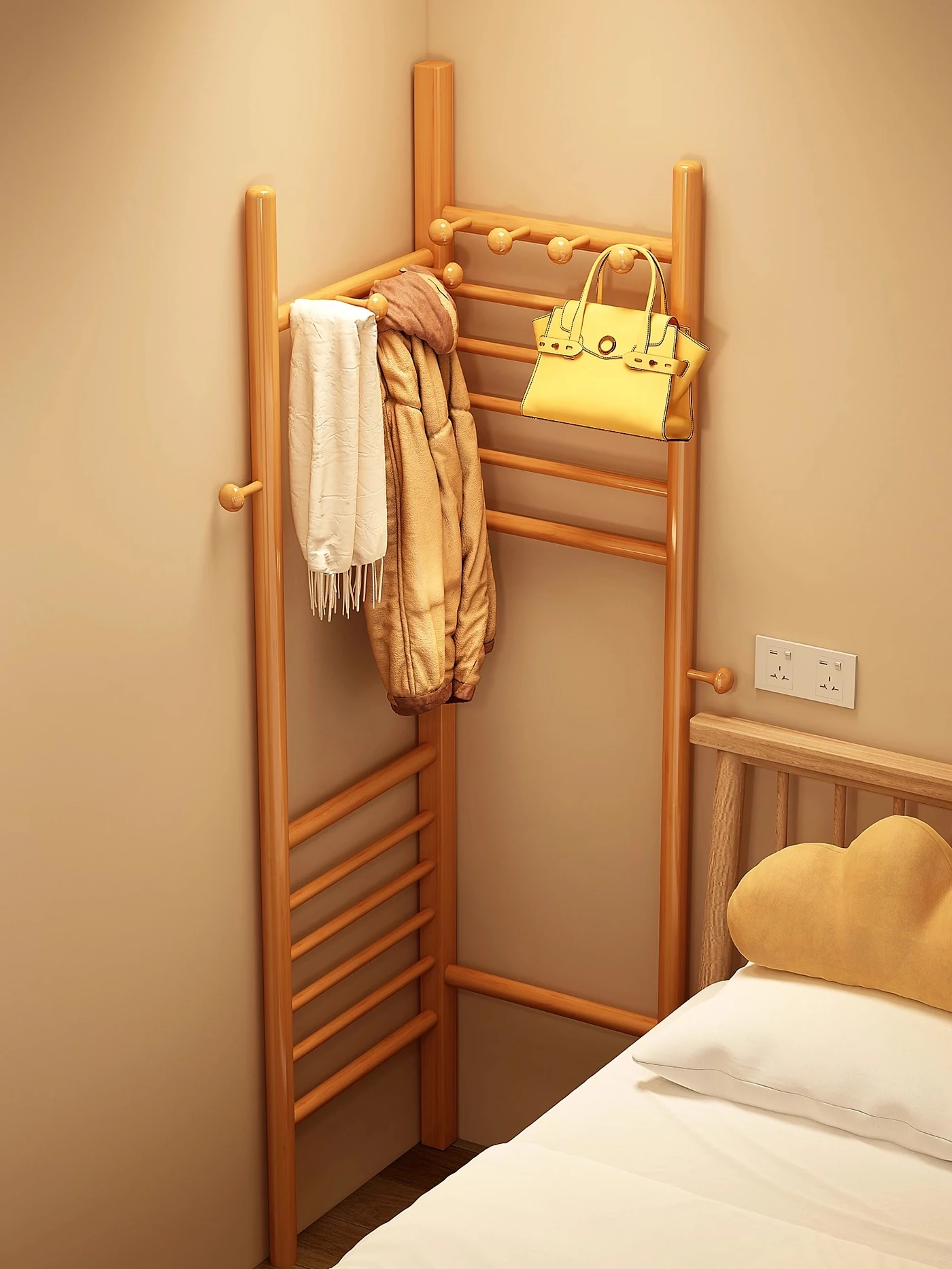 ベッドサイドにぴったり!スペースを取らない角落用ハンガーラック - 夜の衣服やバッグをサッと掛けられる便利な簡易衣帽架。あなたの寝室をスッキリ整頓!