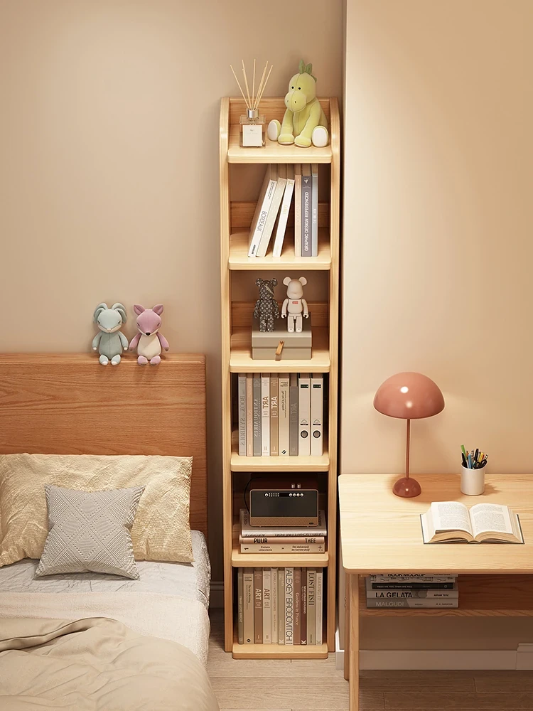寝室用壁面角落収納!実木製ベッドサイド書棚一体型コーナーラック - スペースを有効活用し、スタイリッシュに収納できるナarrowスペースセーバー!