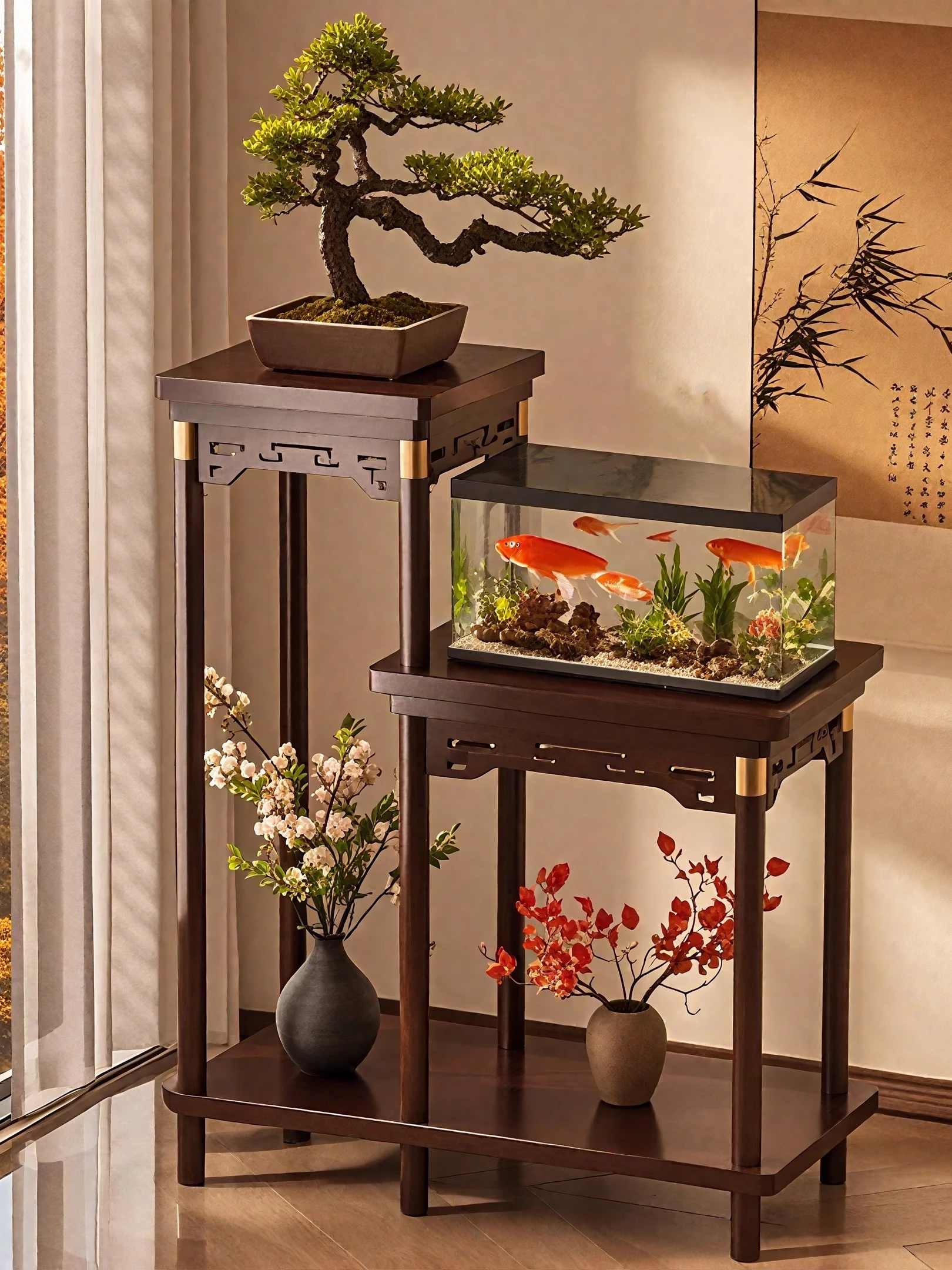 中華風の無垢材フラワースタンド - リビングやバルコニーに最適な床置きタイプ。2025年新作、魚タンクとフラワースタンドが一体化!おしゃれで機能的なインテリアを実現します。