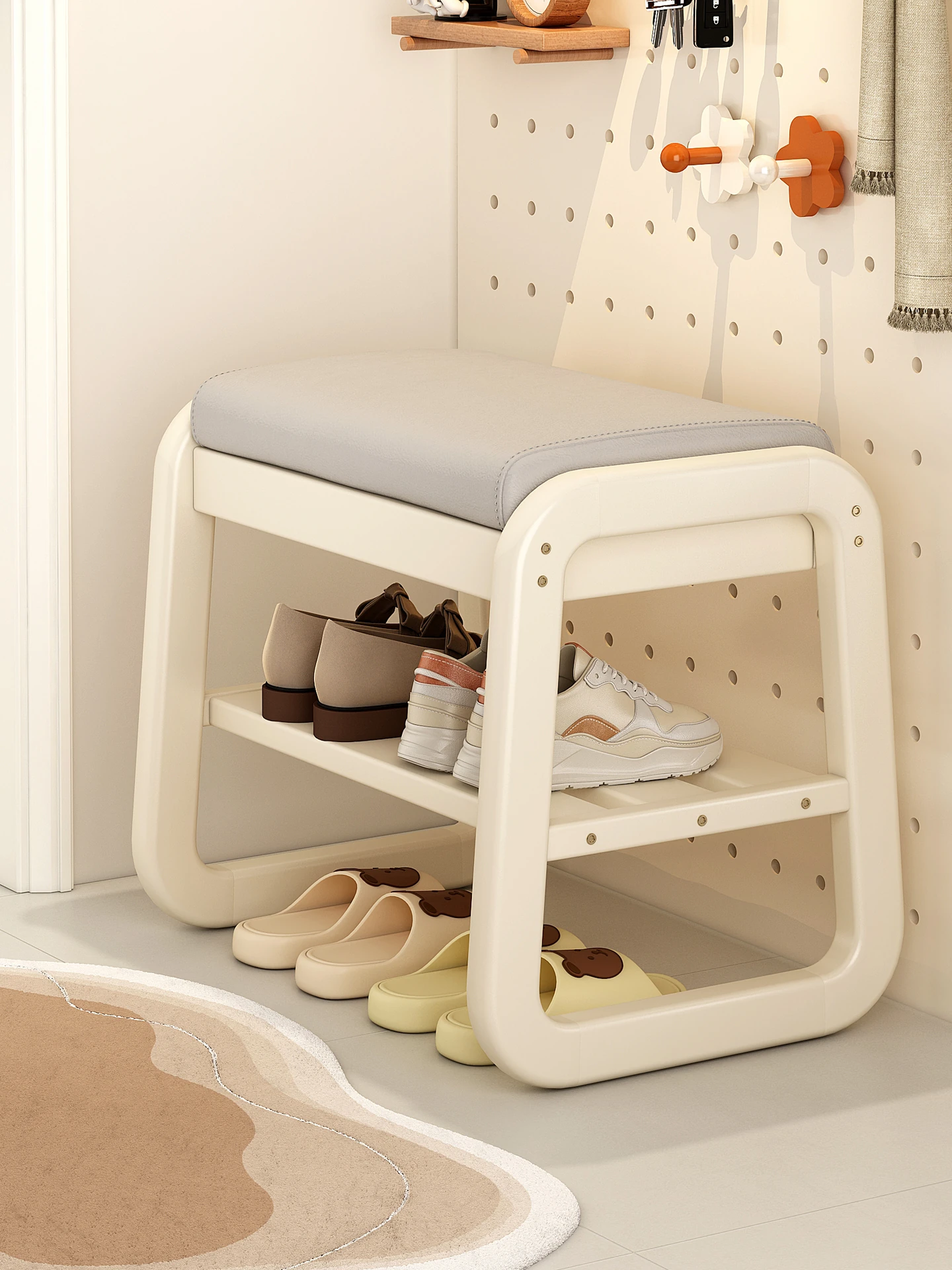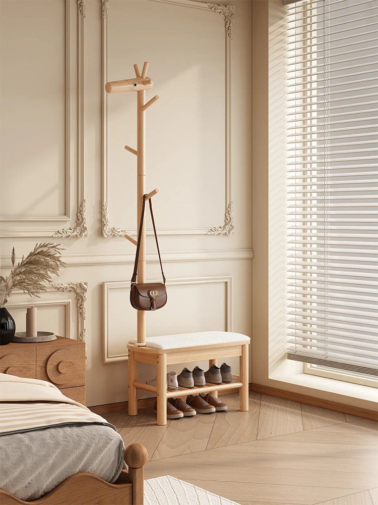 かわいいクリーム風の実木製靴ベンチ・コートハンガー一体型!高級感あふれる軽やかなデザインで、玄関にぴったりの使いやすい靴ラック。おしゃれに靴を履き替えながら、収納もバッチリ!