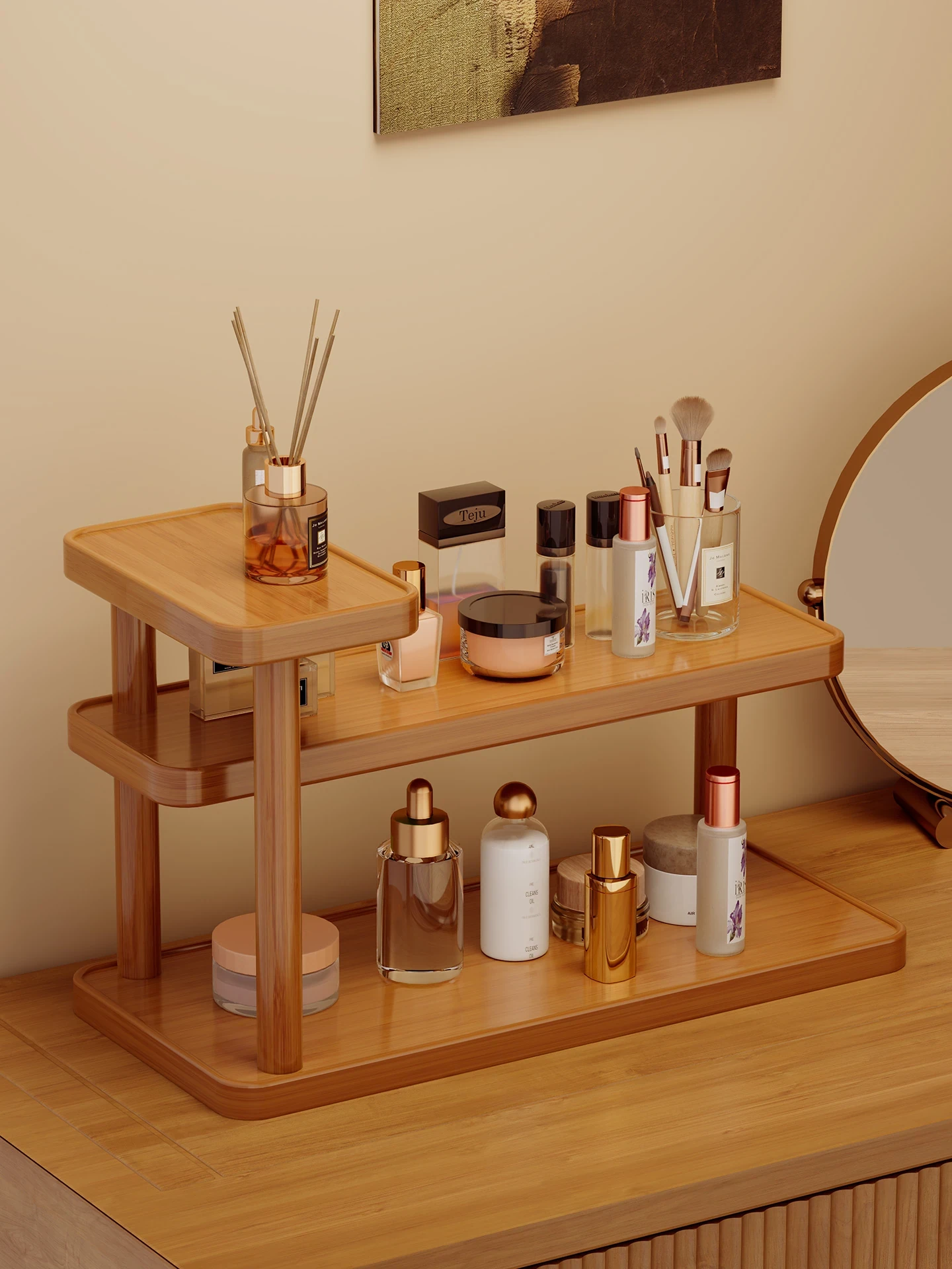 化粧品収納ラック - メイク台に最適!香水・口紅・アクセサリーをおしゃれに整理できる天然木製の収納ボックス。美容アイテムをすっきりと整頓し、あなたのビューティータイムをより魅力的に演出します。