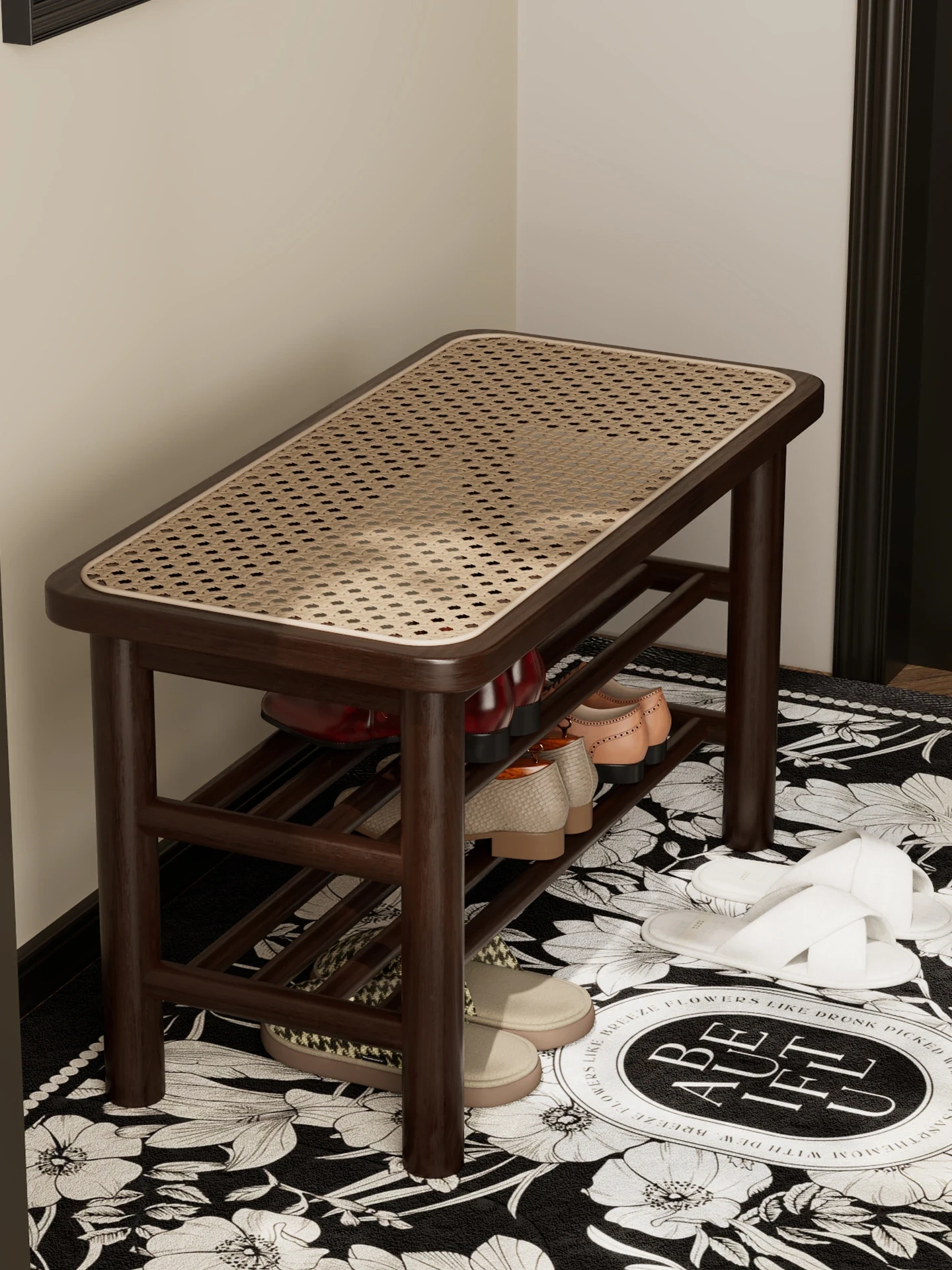 玄関用シューズベンチ|コンパクトでおしゃれな中華スタイル|靴を履く時に便利なシューズラック一体型|狭いスペースにもぴったりなロングベンチ!